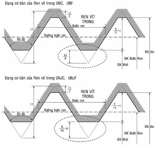 Tương tự đối với ren UNF hay các loại ren khác. Để tra các loại ren này các bạn xem trong sách Machinery’s Handbook Ví dụ NPT1/8-27 Đường kính danh nghĩa là 1/8 inch Bước ren là 27 Thuộc chuẩn NPT (Chuẩn Mỹ)
