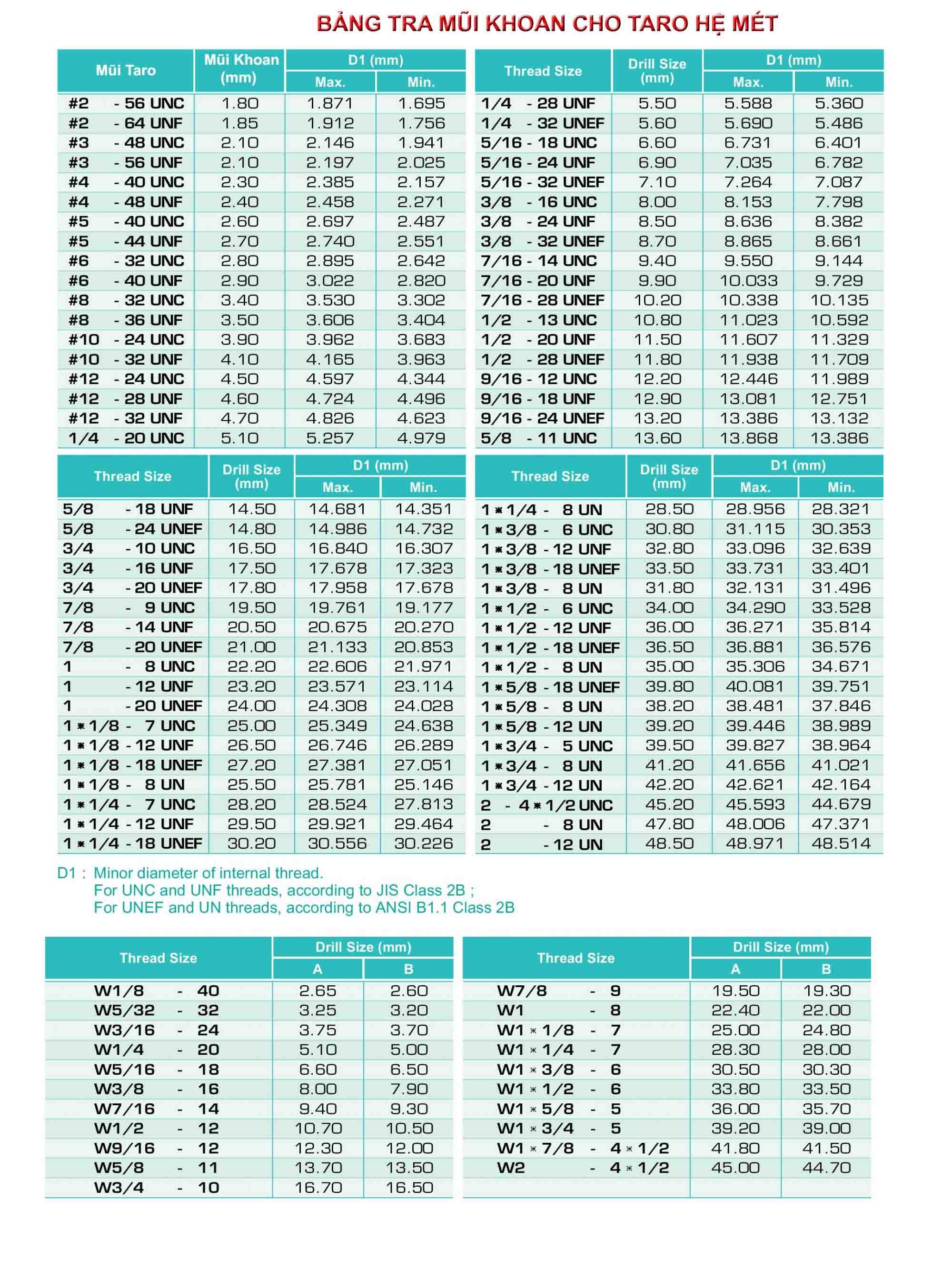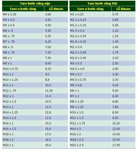 Bảng tra cứu đường kính lỗ khoan tương ứng để taro và tra cứu bước ren chuẩn theo chuẩn ISO
