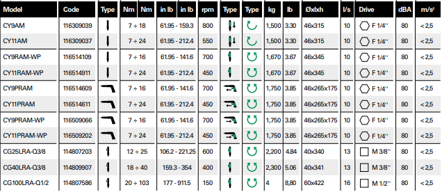 Tua vít khí nén tự động tắt | FIAM CY...AM, CG...LRA gồm những Model